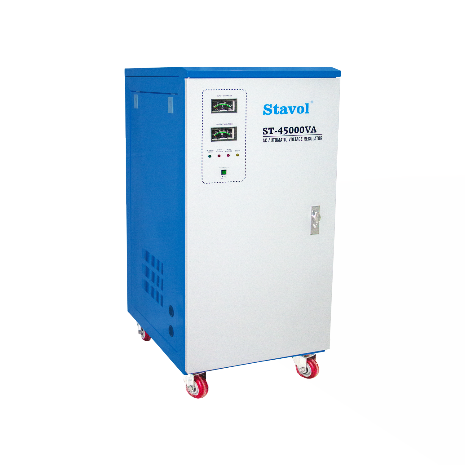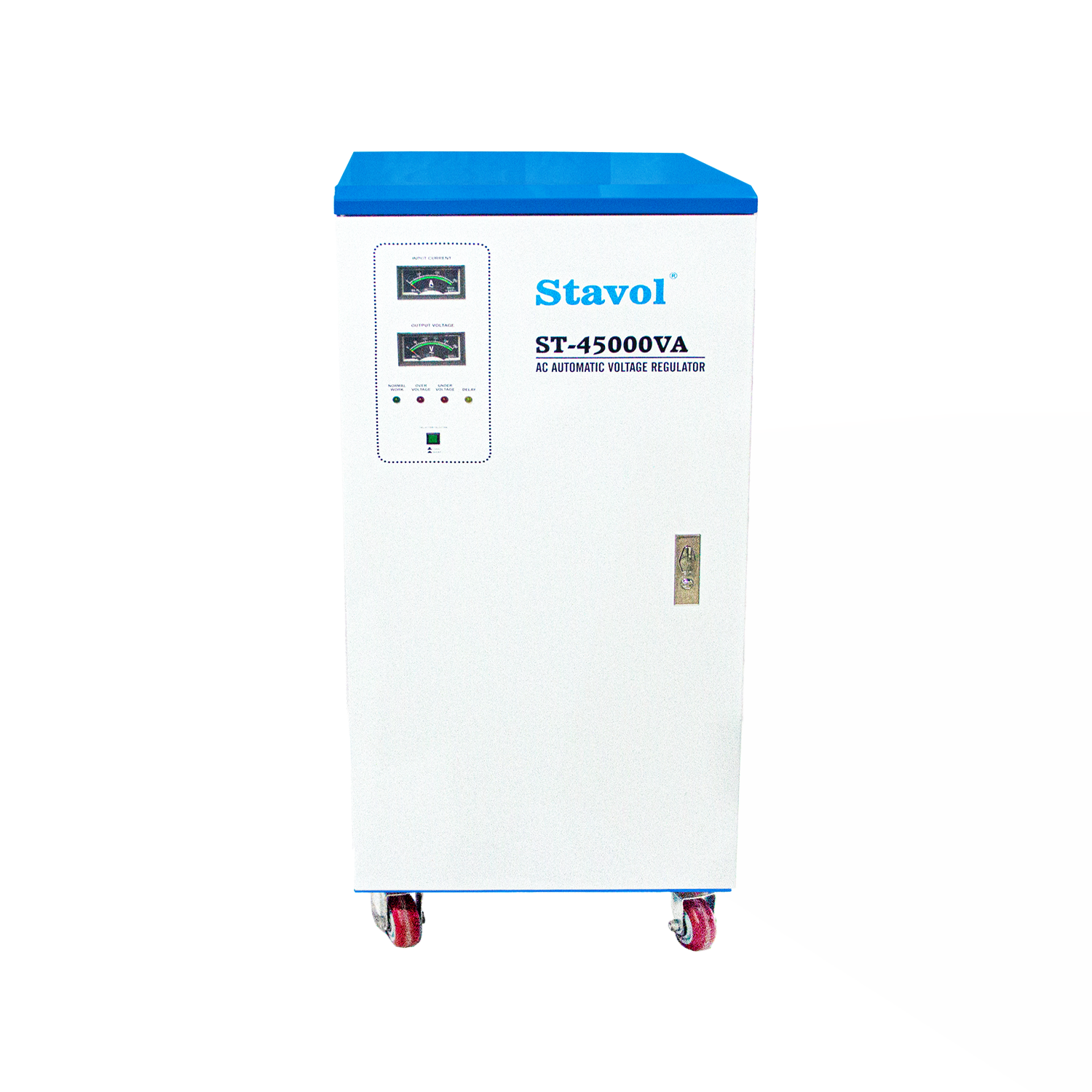 The ST-45,000VA Automatic Voltage Regulator is designed for high-capacity applications, ensuring stable output and reliable protection for sensitive and heavy-duty equipment.