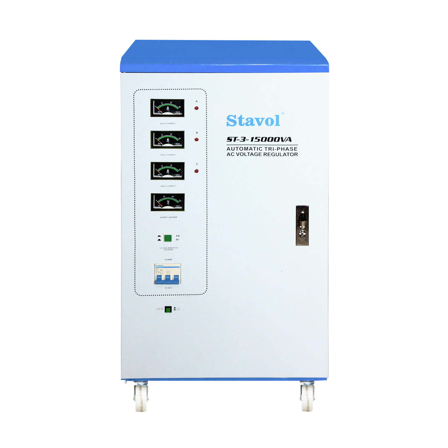 The ST3-15,000VA Automatic Voltage Regulator is a tri-phase AVR engineered to deliver a stable 380V output for industrial and commercial operations. Built with a pure copper transformer, it provides reliable voltage regulation, protection, and long-lasting performance.