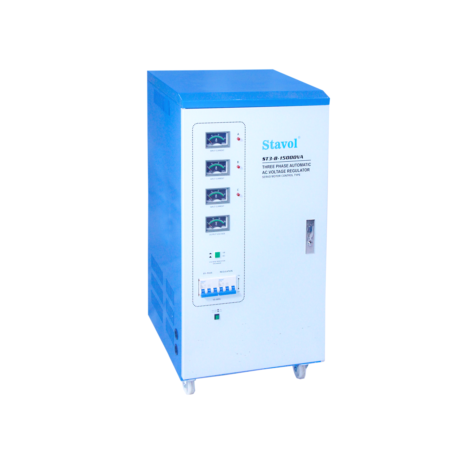 The STAVOL ST3-B-15,000VA Triphase Automatic Voltage Regulator is a heavy-duty voltage stabilization solution designed to protect three-phase electrical systems from unstable power conditions. With its wide input voltage tolerance, pure copper windings, and integrated by-pass function, this AVR ensures continuous and stable 380V output for critical equipment.