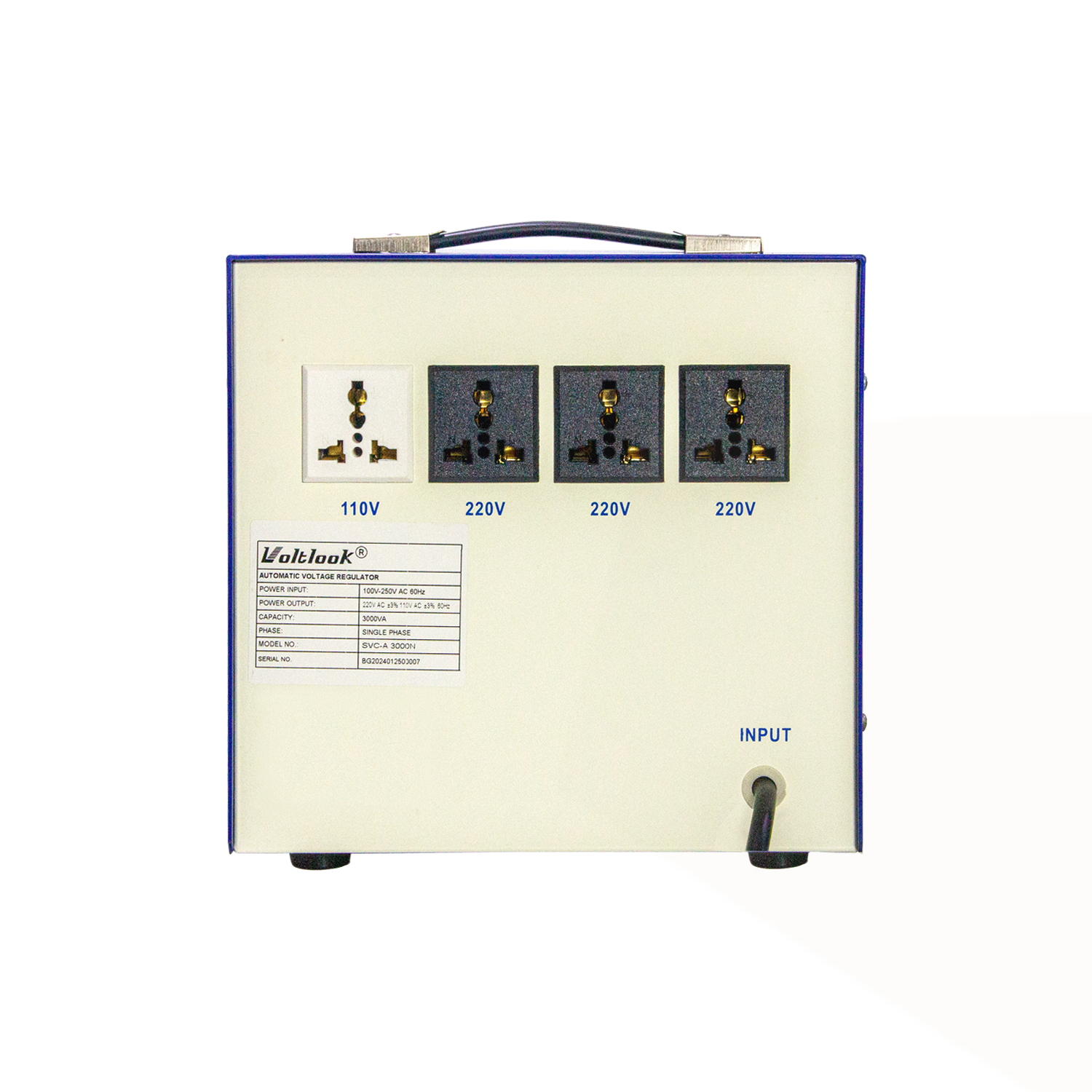 The Voltlook SVC-A 3,000N Automatic Voltage Regulator provides reliable and stable power output to protect your appliances and equipment from voltage fluctuations. Equipped with a servo motor control system and analog display, it ensures precise regulation for both 110V and 220V outputs.
