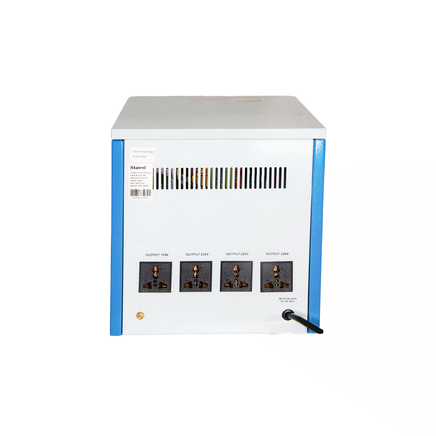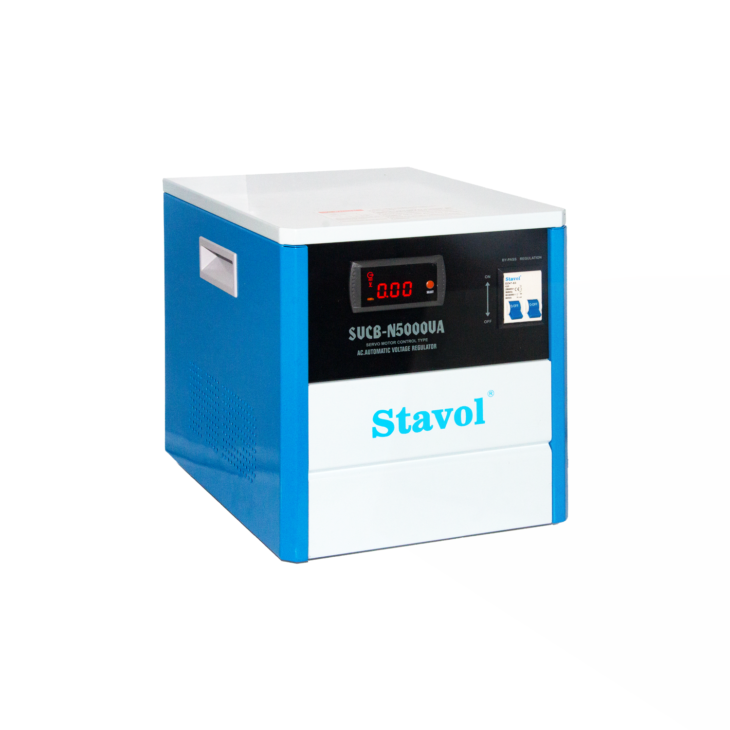The STAVOL AVR SVCB-N5000VA is a high-capacity servo-type automatic voltage regulator designed to provide stable and reliable voltage output for demanding electrical and electronic equipment. Featuring a digital display and built-in by-pass function, this unit allows easy monitoring of input/output voltage, overload, and amperage, ensuring uninterrupted power supply during maintenance or emergencies. Its robust construction makes it suitable for residential, commercial, and light industrial applications.