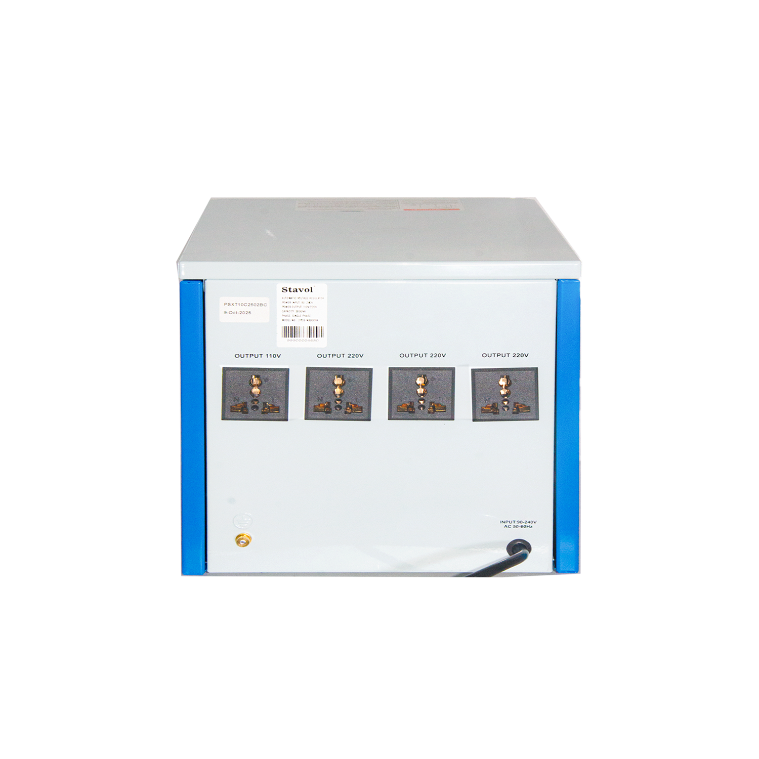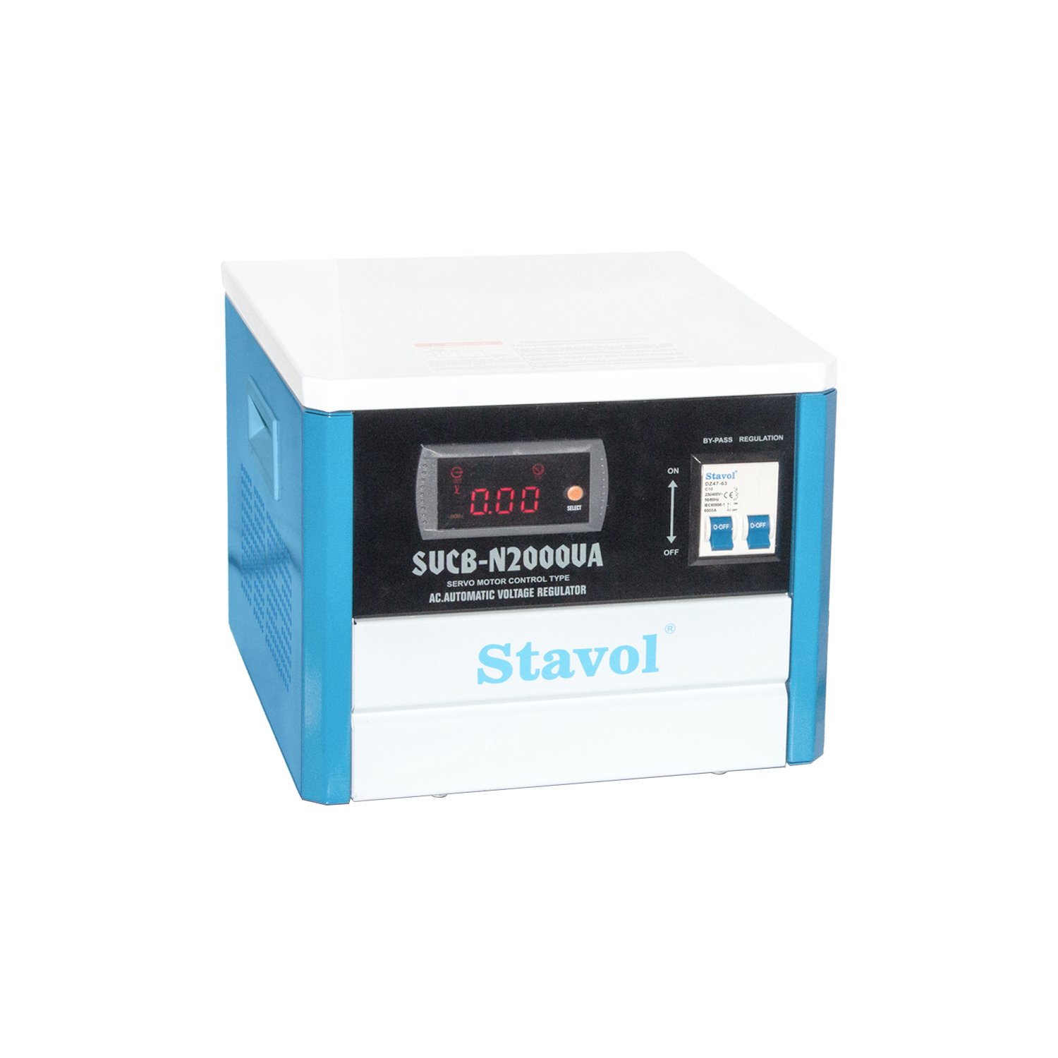 The STAVOL AVR with Digital Display & By-Pass 2000VA (SVCB-N2000VA) features a clean white metal body accented with blue panels, giving it a modern, professional, and industrial-grade appearance. The white finish improves visibility and cleanliness in electrical setups, while the blue accents clearly highlight the control area and digital display for easy operation and monitoring.